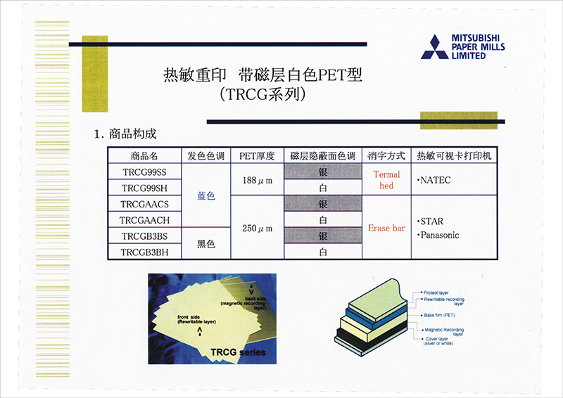 在透明聚酯薄膜(PET)的一面為復(fù)寫可擦除層及保護(hù)層,另一面是膠水層與卡的本體貼合加工使用。 產(chǎn)品形態(tài)有卷狀、片狀、膠帶等各種形態(tài)齊全,可根據(jù)成型方法隨意選擇。 可以對應(yīng)熱敏頭、擦除捧、擦除滾軸等各種消字的式,隨之對于打印機的選擇也很廣泛。 考慮到粘合不同卡體材質(zhì)的產(chǎn)品,因此準(zhǔn)備了特殊PET成分的熱敏材料。